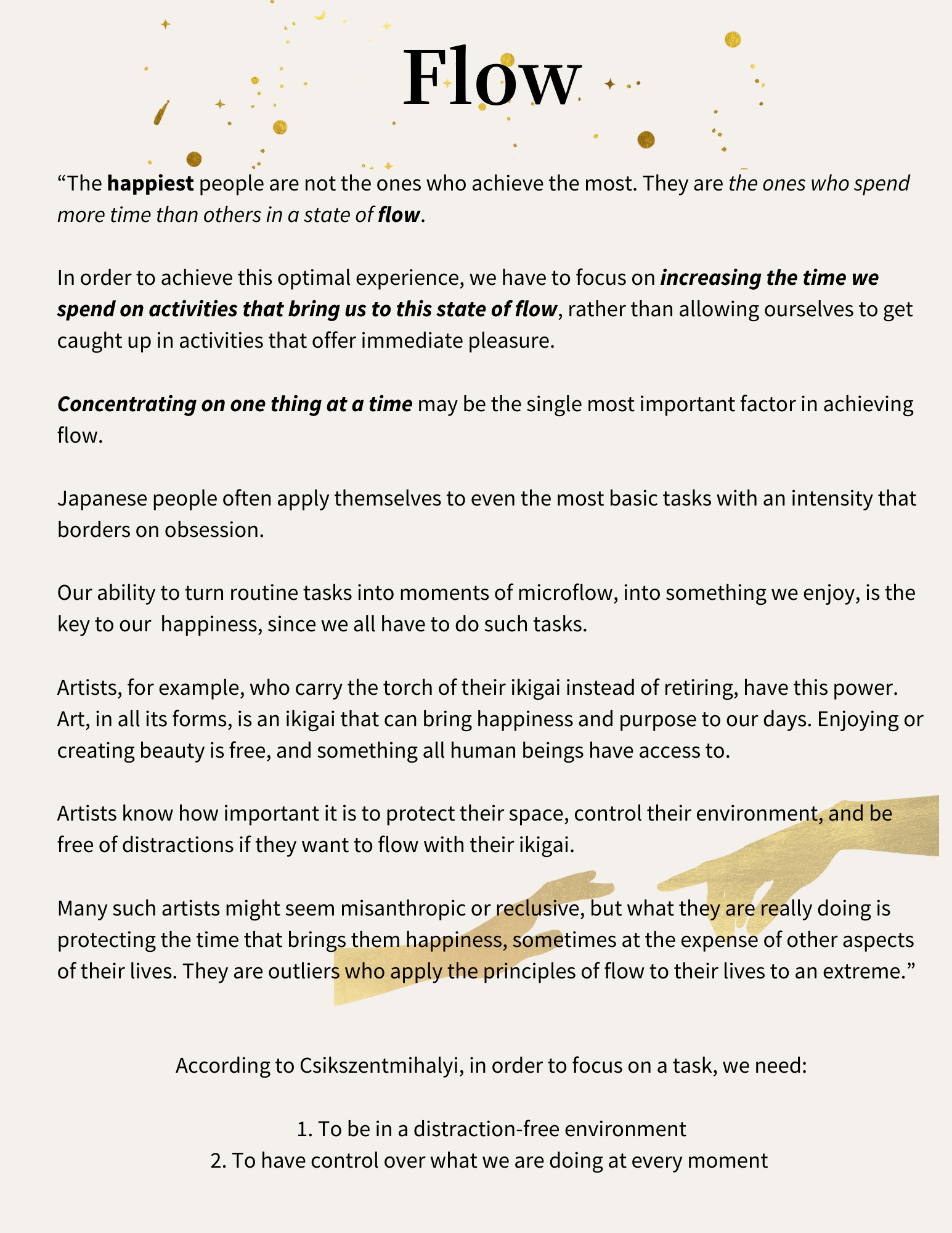“Wenn es Ihnen gelingt, den psychologischen Zustand des "Flow" zu erreichen, wie ihn der in Ungarn geborene amerikanische Psychologe M. Csikszentmihalyi beschrieben hat, werden Sie “das meiste” aus dem Ikigai herausholen, und Dinge wie die tägliche Arbeit werden Ihnen Freude bereiten können. Sie werden nicht das Bedürfnis verspüren, dass Ihre Arbeit oder Ihre Bemühungen anerkannt werden, Sie werden nicht nach einer Belohnung irgendeiner Art suchen. Die Vorstellung, in einem kontinuierlichen Zustand der Glückseligkeit zu leben, ohne nach unmittelbarer Befriedigung durch äußere Anerkennung zu suchen, ist plötzlich zum Greifen nah."